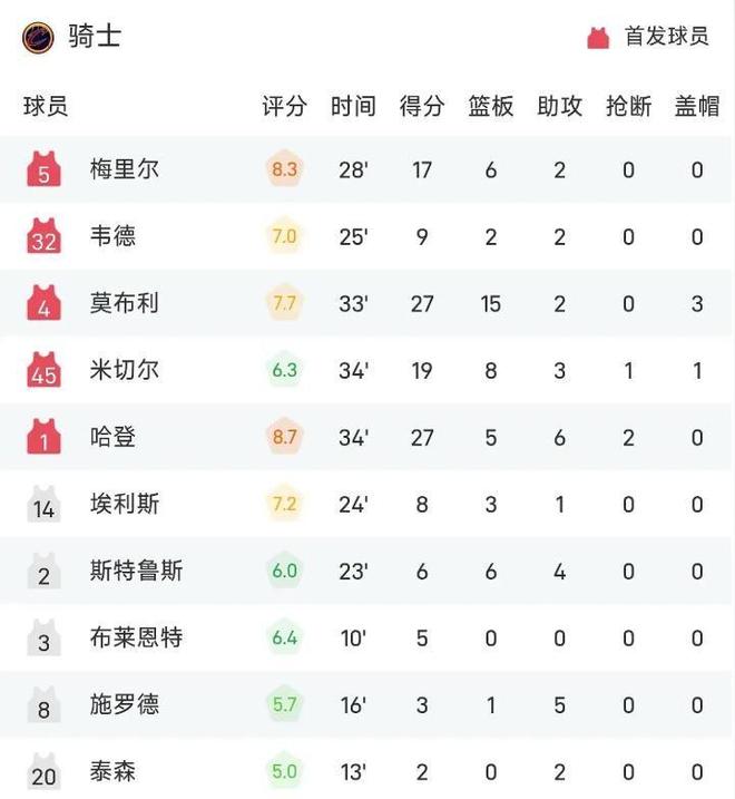 - 哈登高效27+5+6莫布利27+15 騎士勝雄鹿