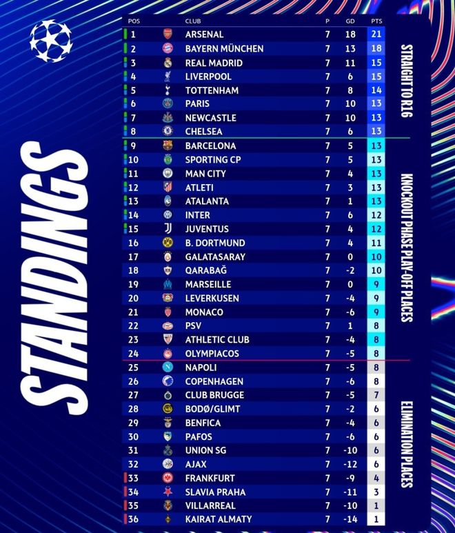 - 歐冠第7輪結(jié)束了9場比賽,最新積分榜如下!