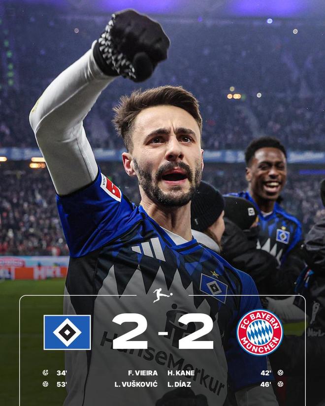 - 2026年02月01日 2輪不勝!拜仁2-2漢堡先賽仍9分領跑 凱恩迪亞斯建功基米希送點