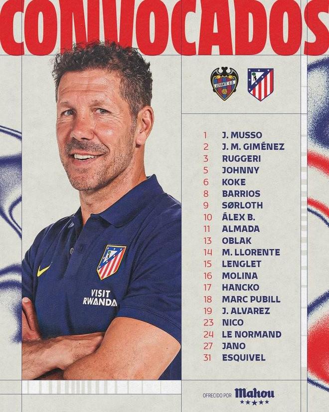- 馬競(jìng)戰(zhàn)萊萬特名單:格子、小西蒙尼缺陣,一隊(duì)外場(chǎng)球員剩16人