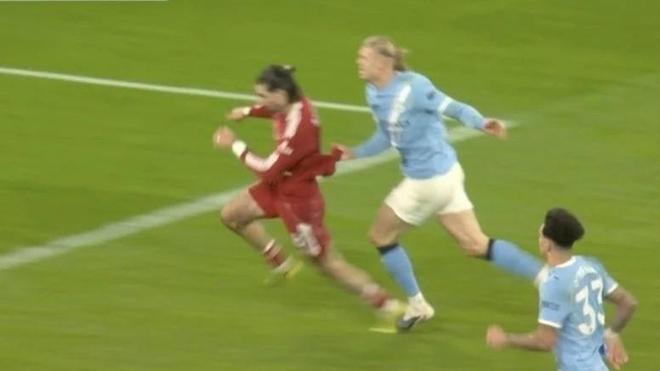 比賽最后階段,利物浦門將阿利松棄門參與進(jìn)攻,切爾基抓住機(jī)會從中場吊射空門。就在皮球滾向球網(wǎng)之際,哈蘭德與索博斯洛伊雙雙回追。過程中,索博斯洛伊拉拽哈蘭德球衣,被認(rèn)定為“破壞明顯進(jìn)球機(jī)會”;而哈蘭德隨后也回手拉了對方一把。