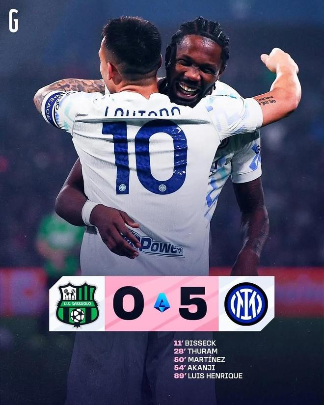 今天凌晨,國米在意甲第24輪客場挑戰(zhàn)薩索洛。上半場,比塞克頭球首開紀(jì)錄,小圖拉姆擴(kuò)大比分,國米2:0領(lǐng)先。下半場,勞塔羅和阿坎吉3分鐘內(nèi)頭頂腳踢將比分?jǐn)U大到4:0,恩里克在終場前抽射破門,最終國米客場取得5:0大勝!