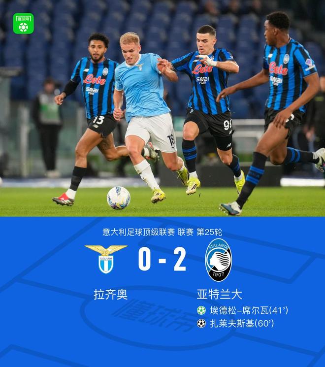 北京時(shí)間2月15日意大利足球頂級(jí)聯(lián)賽第25輪,拉齊奧主場(chǎng)對(duì)陣亞特蘭大。比賽中,上半場(chǎng)埃德松-席爾瓦點(diǎn)射破門首開紀(jì)錄,隨后貝爾納斯科尼助攻,扎萊夫斯基打進(jìn)世界波。最終比分拉齊奧0-2亞特蘭大。