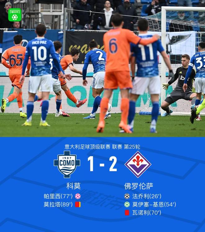 北京時間2月14日意大利足球頂級聯(lián)賽第25輪,科莫主場對陣佛羅倫薩。佛羅倫薩法喬利率先破門,隨后莫伊塞-基恩點球破門,帕里西自擺烏龍,比賽最后階段,莫拉塔抱怨裁判連吃兩黃被紅牌罰下。最終十人科莫 1-2不敵佛羅倫薩。
