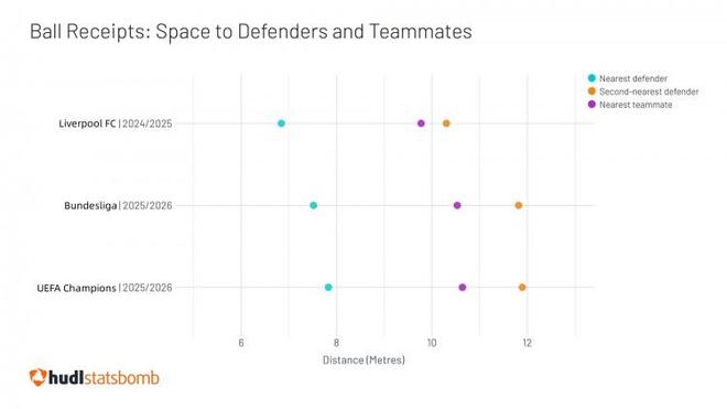 截至英超第23輪,利物浦左路場均突破從迪亞斯離隊前的11.2次降至7.5次,進(jìn)攻三區(qū)傳球成功率從81%跌至65%,造點(diǎn)僅2次,而迪亞斯本賽季在拜仁造點(diǎn)6次,成為德甲造點(diǎn)王。過往在利物浦迪亞斯并不是絕對核心,也不是絕對主力,單看數(shù)據(jù)他上賽季甚至不如“神秘內(nèi)切男”加克波,但失去迪亞斯的沖擊力導(dǎo)致利物浦的高位壓迫體系場均前場壓迫次數(shù)從18.5次降至15.2次,反擊機(jī)會減少35%。