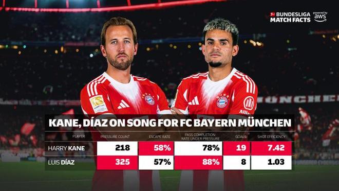 第一輪國家德比前,德甲官方數(shù)據(jù)AWS就曾強(qiáng)調(diào)指出:路易斯·迪亞斯在壓力下極為冷靜。在本賽季的127次壓迫情境中,迪亞斯成功擺脫了其中的60%。更令人印象深刻的是,在壓迫下,這位哥倫比亞人的傳球成功率高達(dá)86%(數(shù)據(jù)截止2025年10月17日)。