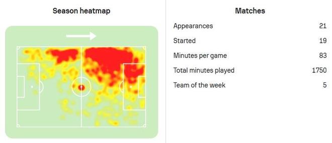 對陣霍芬海姆的比賽只是迪亞斯極致效率淋漓盡致的一次展現(xiàn):單場5次射門4次射正,10次過人7次成功,傳球成功率高達(dá)94.7%,而帽子戲法加兩造墊也讓其單場參與進(jìn)球數(shù)追平拜仁隊史邊鋒紀(jì)錄。而將時間線拉至整個2025-26賽季,迪亞斯數(shù)據(jù)升級后的效率會更加明顯。