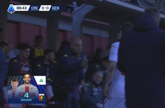 比賽末段,熱那亞主帥德羅西讓替補(bǔ)席上的亞歷山德羅-阿莫林起身,準(zhǔn)備換下弗倫德魯普。轉(zhuǎn)播圖像顯示了兩人的名字與照片:弗倫德魯普配的是本人照片,但阿莫林那一欄卻“畫風(fēng)不對(duì)”——頭像并非年輕的熱那亞中場(chǎng)亞歷山德羅-阿莫林,而是前曼聯(lián)主帥魯本-阿莫林,他不久前剛被曼聯(lián)解雇。