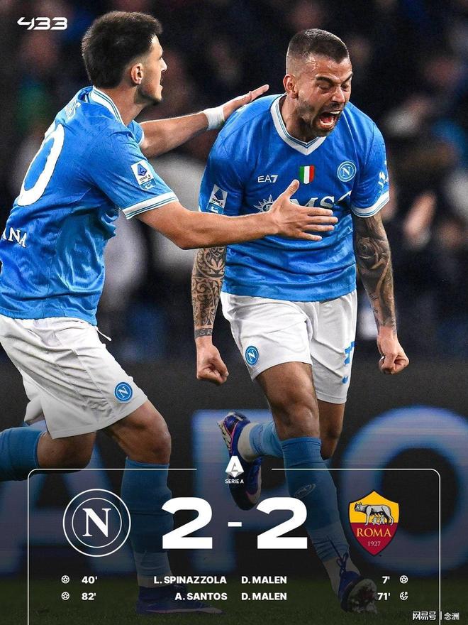 意甲第25輪,那不勒斯主場2-2羅馬,50分第三,羅馬47分第四。馬倫先拔頭籌,斯皮納佐拉世界波,韋斯利造點+傷退,馬倫點射破門連場雙響,阿利森-桑托斯替補建功。