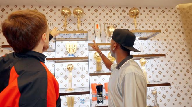 我現(xiàn)在在馬德里,就在維尼修斯家門口。今天我們要帶大家看看他家里的一些細(xì)節(jié),更重要的是,看看足球之外的維尼修斯。我們會(huì)陪他去參加一個(gè)活動(dòng),因?yàn)樗l(fā)布自己的新球鞋。一路上我們也會(huì)在車?yán)锪奶?。不過在出發(fā)前,先參觀一下他的家,因?yàn)檫@里有很多他拿到的個(gè)人獎(jiǎng)杯、皇家馬德里的榮譽(yù),我覺得會(huì)讓你們很驚訝。我們現(xiàn)在真的就在他家門口,敲敲門看看他會(huì)不會(huì)開門。晚上好。你怎么樣?
