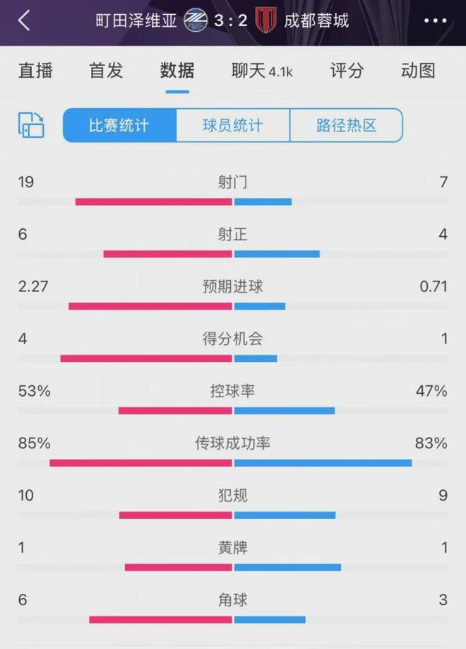 賽后數(shù)據(jù)統(tǒng)計(jì)顯示,蓉城全場(chǎng)射門7-19,射正4-6,控球率僅47%,得分機(jī)會(huì)1-4。每一項(xiàng)關(guān)鍵數(shù)據(jù)都在被對(duì)手碾壓。要知道,町田此役輪換了包括主力門將在內(nèi)的9名球員,基本算是一支“二隊(duì)”甚至“三隊(duì)”陣容。