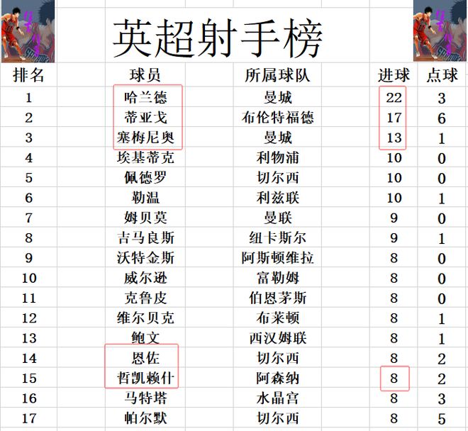 射手榜方面,哈蘭德22球繼續(xù)領跑,蒂亞戈5球之差位列第2,塞梅尼奧13球排在第3。哲凱賴什今天未能進球,還是和沃特金斯,維爾貝克,恩佐,帕爾默等人8球剛好擠入前十。