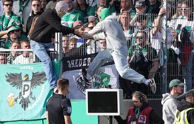 一張照片顯示,一名戴著綠色頭套的疑似“拔插頭者”從場(chǎng)地內(nèi)區(qū)域跳回看臺(tái)。目前尚不清楚這名極端球迷是否真的對(duì)VAR破壞事件負(fù)責(zé),也不清楚為什么電源接口會(huì)如此容易接觸,以及為什么沒有人重新插回電源。無論如何,由于沒有視頻畫面,主裁比克爾無法自行作出點(diǎn)球判罰,于是來自科隆VAR中心的助理裁判介入。