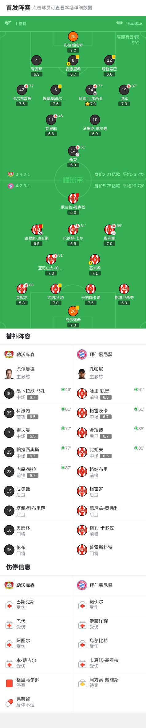 - 勒沃庫(kù)森vs拜仁:??恕⒖浒菜_首發(fā),基米希、路易斯-迪亞斯出戰(zhàn)