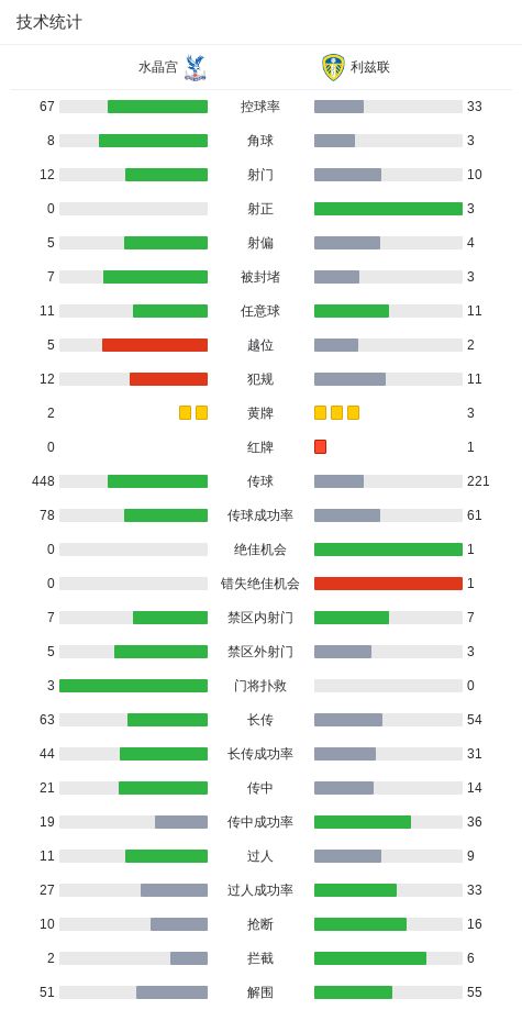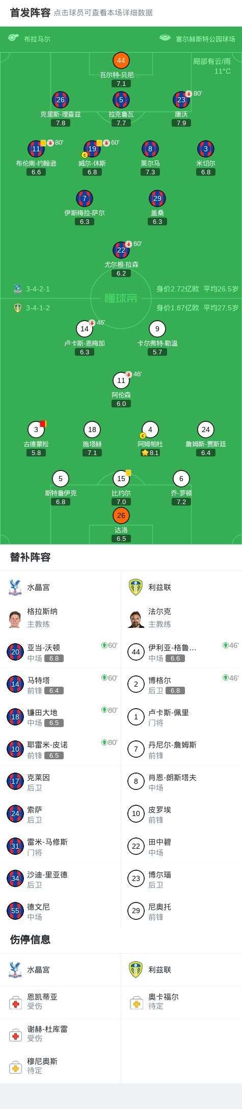 - 水晶宮0-0十人利茲聯(lián),勒溫失點,古德蒙松染紅
