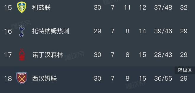 本輪英超10場比賽已有8場戰(zhàn)罷,西漢姆聯(lián)和諾丁漢森林本輪皆得到1分,這意味著熱刺距離懸崖邊緣又近了一步。