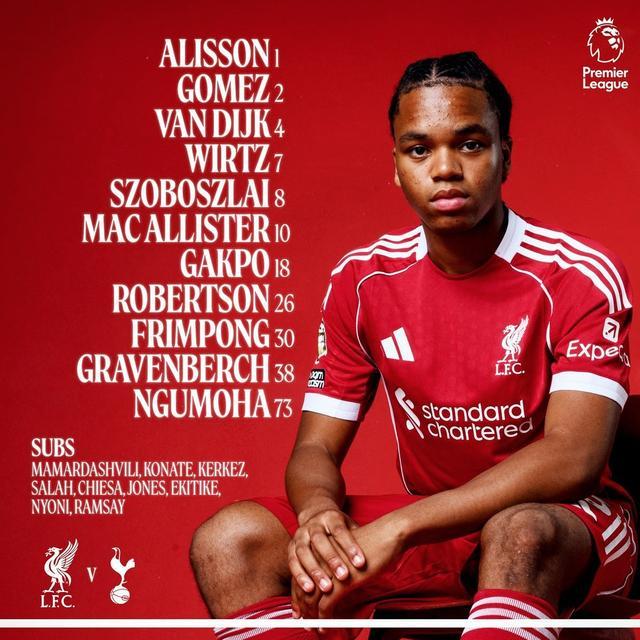 利物浦首發(fā):1-阿利松、26-羅伯遜、4-范戴克、2-喬-戈麥斯、30-弗林蓬、38-赫拉芬貝赫、8-索博斯洛伊、10-麥卡利斯特、7-維爾茨、18-加克波、73-恩古莫哈