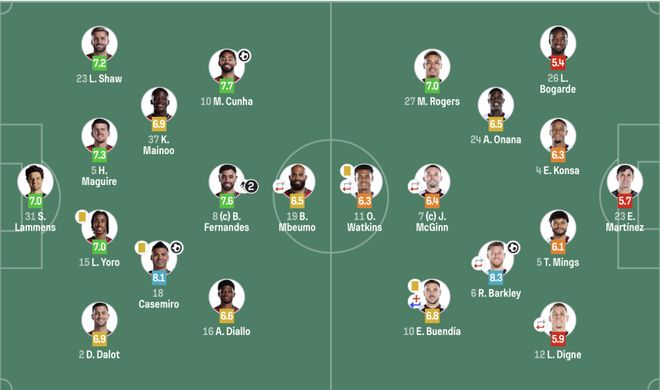 維拉(4231):23-馬丁內(nèi)斯;26-博加德,4-孔薩,5-明斯,12-迪涅;6-巴克利,24-奧納納;7-麥金(61’31-拜利),27-羅杰斯,10-布恩迪亞;11-沃特金斯(61’18-亞伯拉罕)