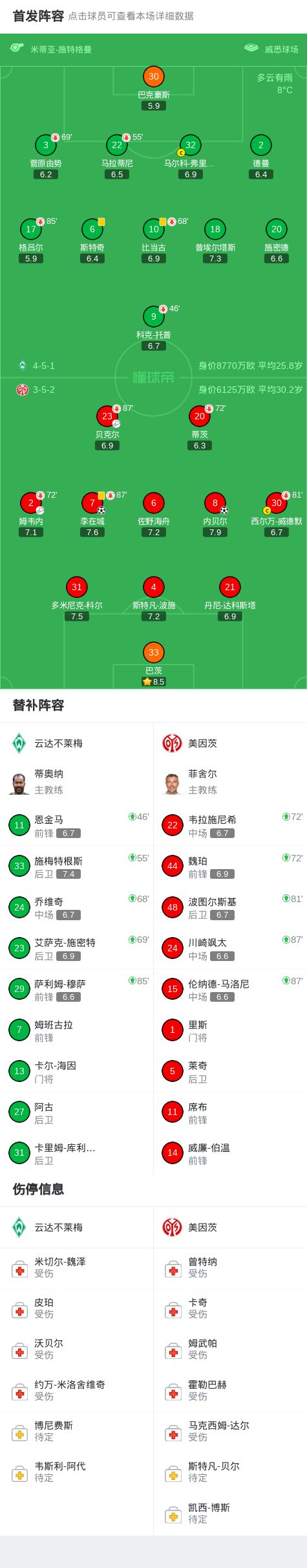 北京時(shí)間3月15日德國(guó)足球頂級(jí)聯(lián)賽 聯(lián)賽 第26輪,云達(dá)不萊梅主場(chǎng)對(duì)陣美因茨。美因茨內(nèi)貝爾破門,李在城破門。最終比分云達(dá)不萊梅 0-2 美因茨。