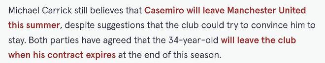 卡里克在賽后承認,卡塞米羅的狀態(tài)使他成為當前球隊不可或缺的一員。只是雖然有傳言稱曼聯(lián)可能會試圖挽留卡塞米羅,卡里克仍然認為巴西中場今夏會離開,他在合同期滿后自由轉(zhuǎn)會,已經(jīng)通過俱樂部進行了官宣。