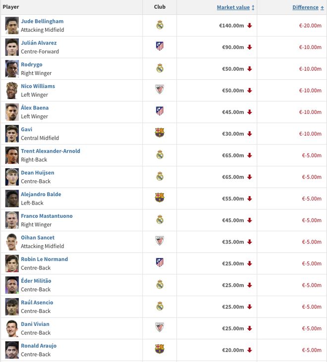 - 西甲身價(jià)跌幅榜:貝林厄姆2000萬(wàn)歐居首,小蜘蛛、羅德里戈、加維1000萬(wàn)歐