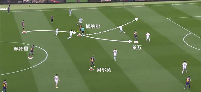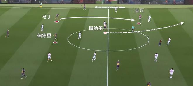 隨后的這次進(jìn)攻中也是一樣的道理,萊萬接應(yīng)馬丁直塞,這時(shí)候博納爾就往前插了,佩德里再一次處于靠后的位置。