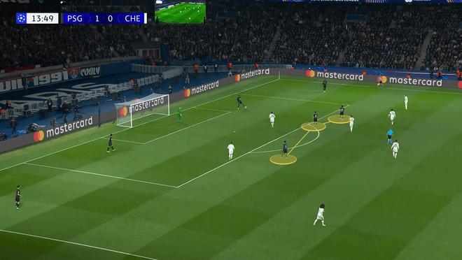 舉個(gè)典型案例,球門球開出后,大巴黎三名中場(chǎng)在己方禁區(qū)前沿緊密靠攏。