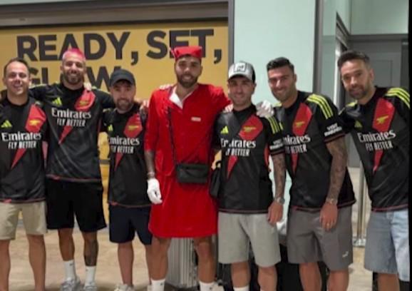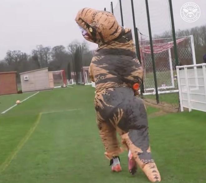 顯然是在我的單身派對(duì)上,朋友們讓我打扮成空乘人員的樣子去美國。另外,我在布倫福德膝蓋受傷復(fù)出后,第一次訓(xùn)練時(shí),我打扮成了恐龍的樣子。?