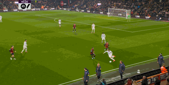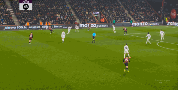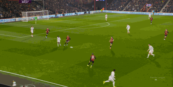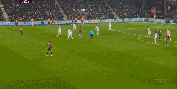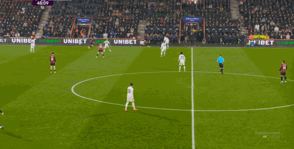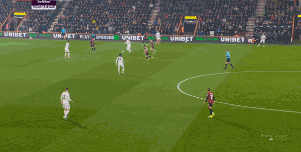 如果布魯諾一直保持拉揚接球時的站位,他是可以堵住橫移線路,從而降低伯恩茅斯進攻效率的: