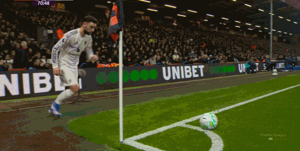 這個時候,曼聯(lián)面對的危險并不大,但就在拉揚把球從右路轉回左路的時候,布魯諾的選位讓曼聯(lián)出現(xiàn)了問題。