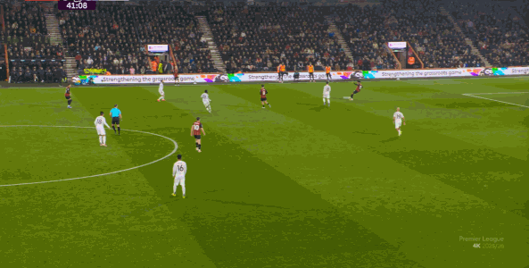 于是在這次轉換中,伯恩茅斯擊穿曼聯(lián)的中路,隨后從左路送上傳中: