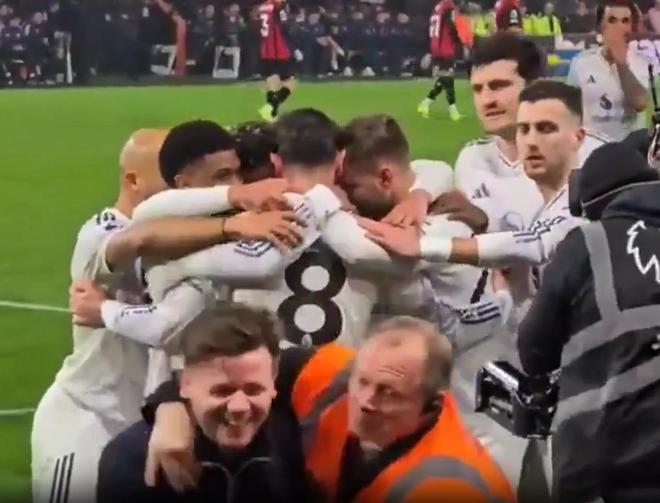 - 一球迷在曼聯(lián)球員慶祝時(shí)混入其中和B費(fèi)擁抱,達(dá)洛特神情疑惑