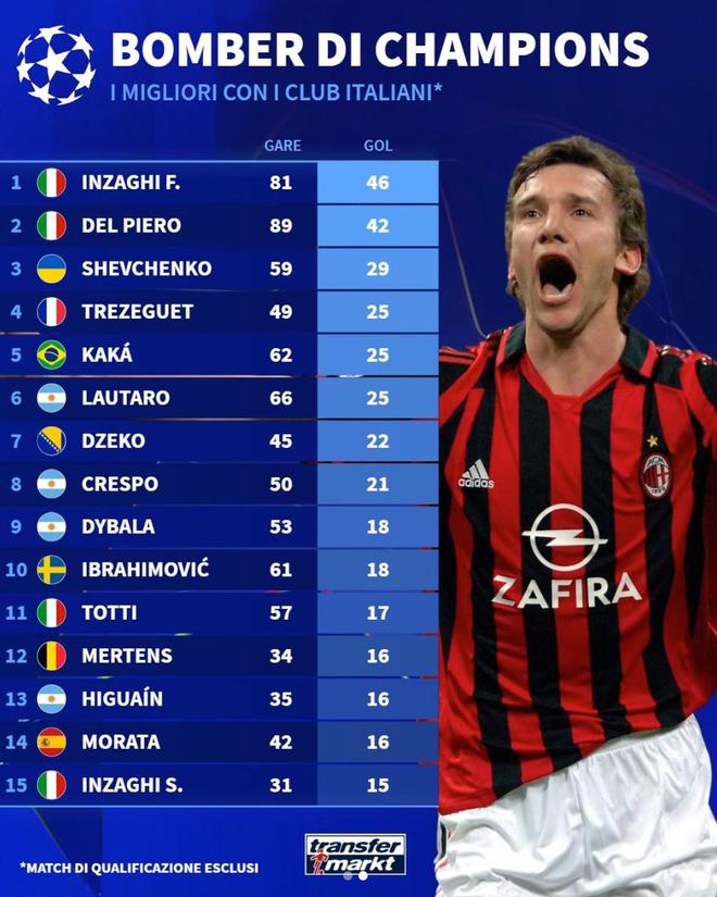 意甲球員歐冠歷史射手榜TOP15:
