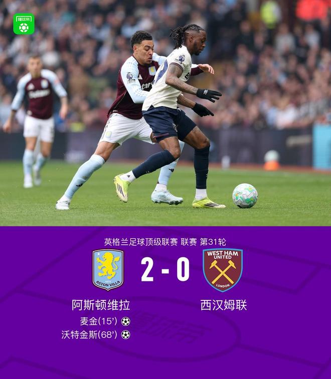 - 維拉2-0西漢姆聯(lián),麥金破門,沃特金斯進(jìn)球