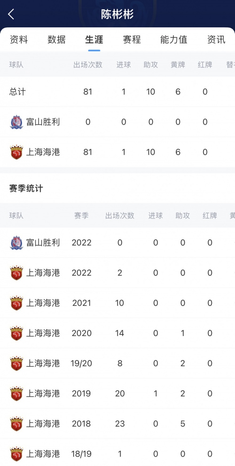 雖然很早就在上海上港一線隊獲得出場機會,但陳彬彬近幾年幾乎淡出賽場,也有過因為傷病而缺席整個賽季的經(jīng)歷。他上一次在國內(nèi)聯(lián)賽進球,發(fā)生在2019賽季中超第18輪上海上港vs河北華夏幸福的比賽中。