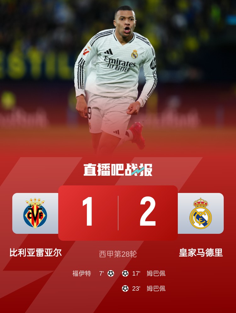西甲第28輪,皇馬2-1逆轉(zhuǎn)比利亞雷亞爾,姆巴佩梅開二度。