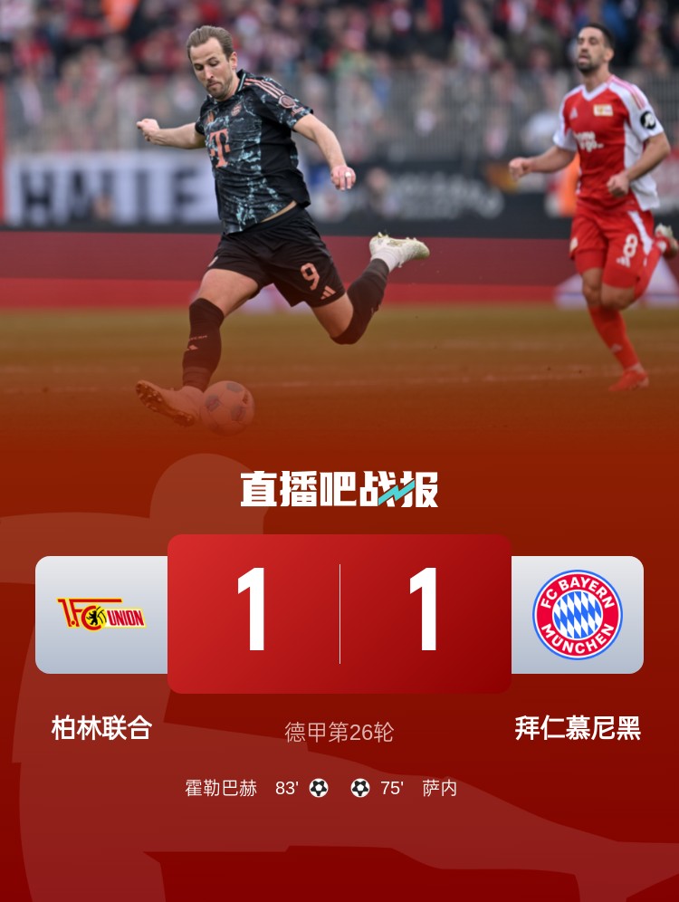 德甲第26輪,拜仁客場1-1柏林聯(lián)合,薩內(nèi)替補建功,烏爾比希失誤。