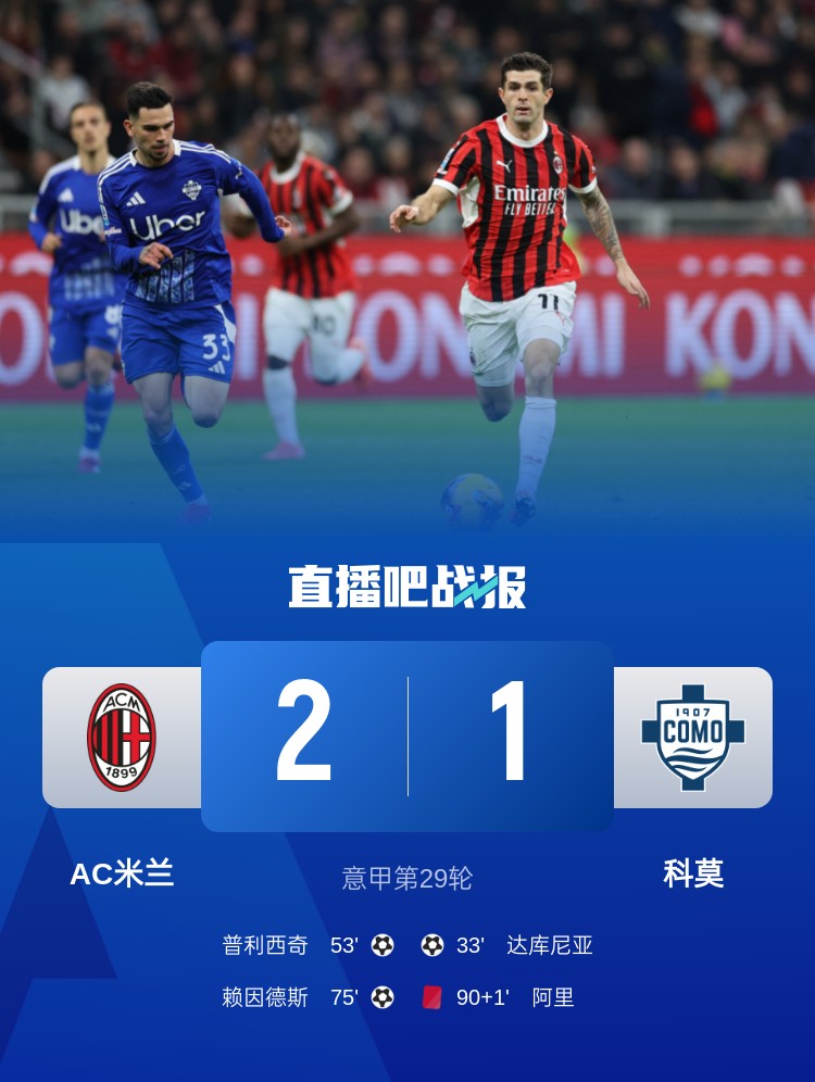 意甲2連勝!米蘭2-1逆轉(zhuǎn)雙殺科莫 賴因德斯傳射+中楣阿里首秀染紅
