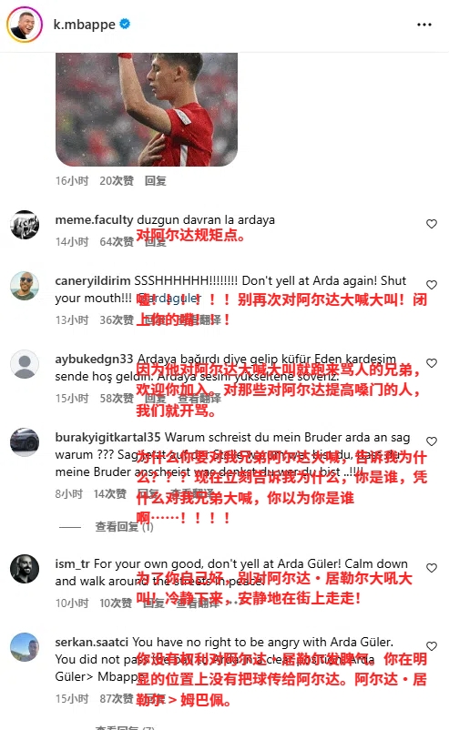姆巴佩的社媒賽后成為居勒爾球迷的宣泄口,在姆巴佩置頂?shù)募用嘶蜀R推文中,大量土耳其球迷怒懟姆巴佩。
