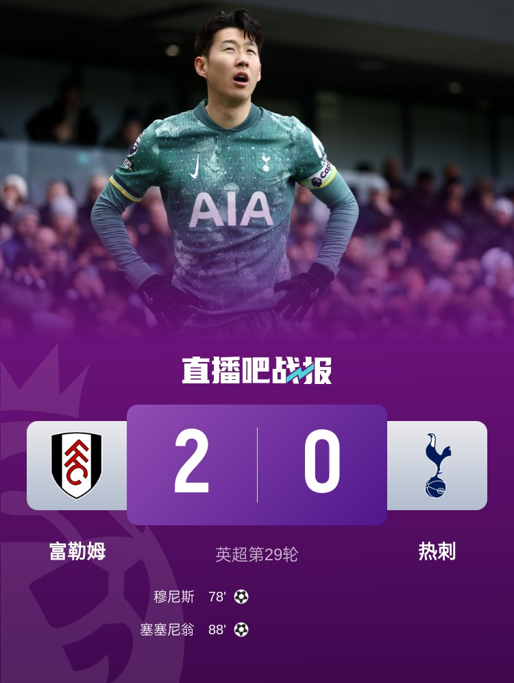 熱刺0-2不敵富勒姆,三輪不勝仍居第13。