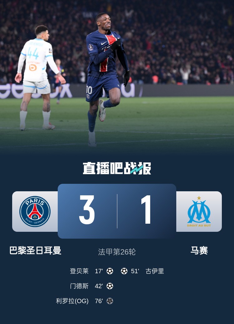 笑傲德比!巴黎3-1馬賽26輪不敗19分領(lǐng)跑 登貝萊法甲賽季第21球