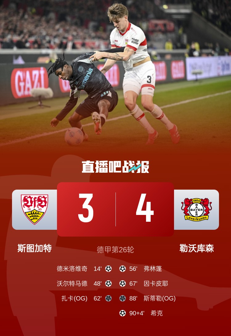 ??搜a(bǔ)時(shí)頭球絕殺,勒沃庫(kù)森4-3逆轉(zhuǎn)斯圖加特。積分榜方面,勒沃庫(kù)森落后拜仁6分。
