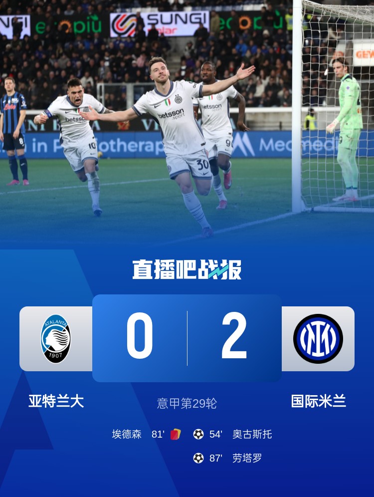 奧古斯托、勞塔羅破門,巴斯托尼、埃德森均兩黃一紅被罰下。最終國(guó)米2-0擊敗亞特蘭大。