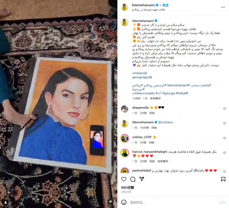 外媒:伊朗一畫家希望向C羅贈送禮物,她為喬治娜準備了畫作