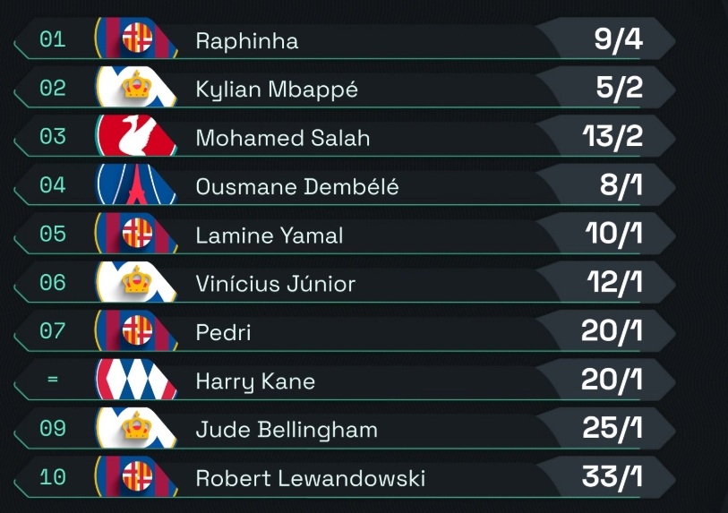 金球獎(jiǎng)賠率:拉菲尼亞居首、姆巴佩第二,皇薩球員7人進(jìn)前十