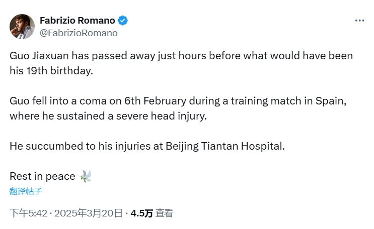 03月20日訊 18歲的國(guó)安青訓(xùn)小將郭嘉璇昨日去世, 羅馬諾在社媒發(fā)文表示哀悼。