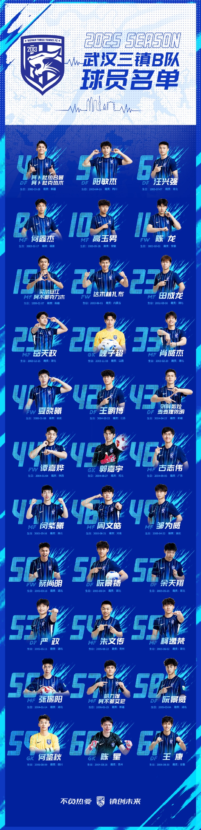 新賽季中乙聯(lián)賽開戰(zhàn)在即,身披上賽季U21聯(lián)賽冠軍的榮光,武漢三鎮(zhèn)B隊即將踏上嶄新的戰(zhàn)場。讓我們跟隨名單去認(rèn)識各位隊員,感受來自三鎮(zhèn)的青春力量!