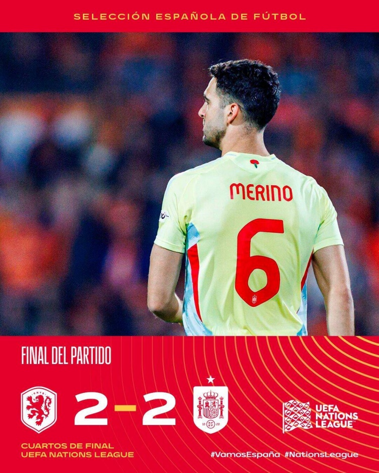 梅里諾補(bǔ)時絕平,荷蘭2-2西班牙,西班牙歐國聯(lián)五連勝終結(jié)。