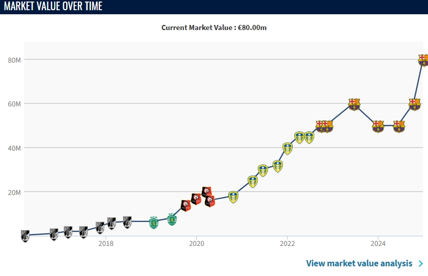 03月21日訊 今日德轉(zhuǎn)更新西甲球員身價(jià),巴薩前鋒拉菲尼亞本賽季表現(xiàn)出色,但他的身價(jià)并沒(méi)有變化,仍為8000萬(wàn)歐元。