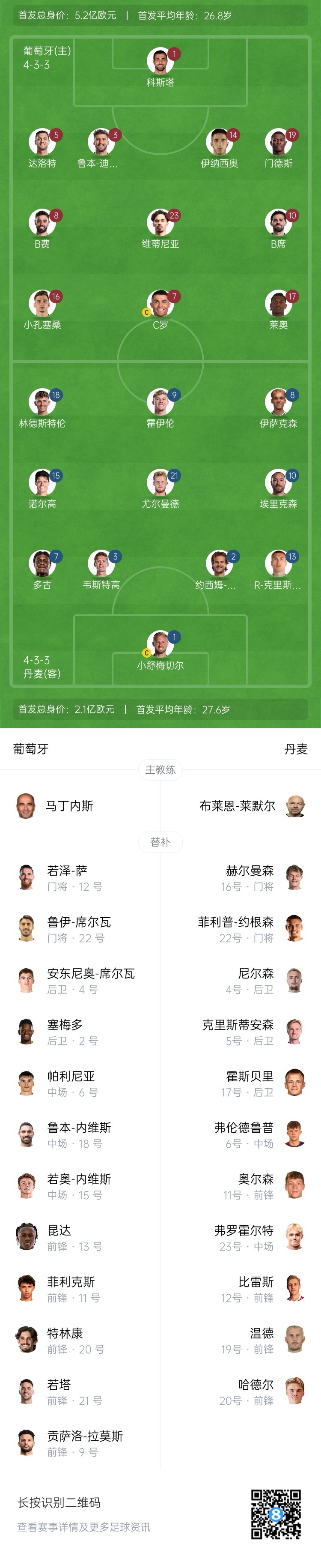 葡萄牙vs丹麥首發(fā):C羅領(lǐng)銜,B費、B席、萊奧先發(fā),霍伊倫出戰(zhàn)